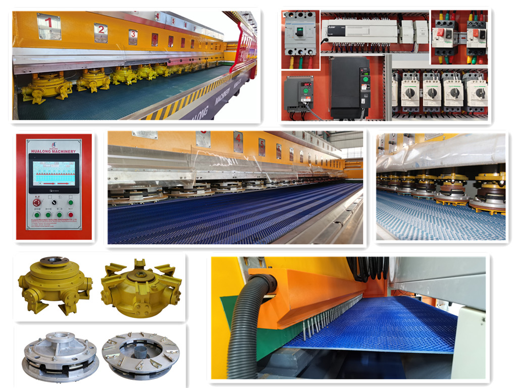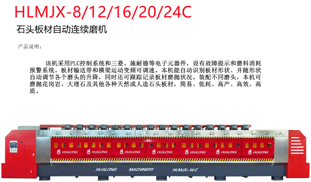 Main FeaturesHLMJX-16,equipped with multiple resin disc heads and PLC control system, can grind and plolish slabs continously and automatically, is perfect for surface finishing of hard stone such as granite. Mounted with different type of heads, it’s also great for marble, quartize and other stone slab finishing.1) Using PLC electrical system and LCD screen menu offer intelligent control. 2) Processing width and working pressure of grinding heads can be adjusted freely . 3) Sensor at the entrance to scan the shape of the slabs in sequence and transmit the signal to controlling unit for precise working 4) Adopting central automatic lubrication system, having all moving parts and bearings to get a good lubricating effect and longer life. 5) Conveyor self-cleaning and stone chip removing system